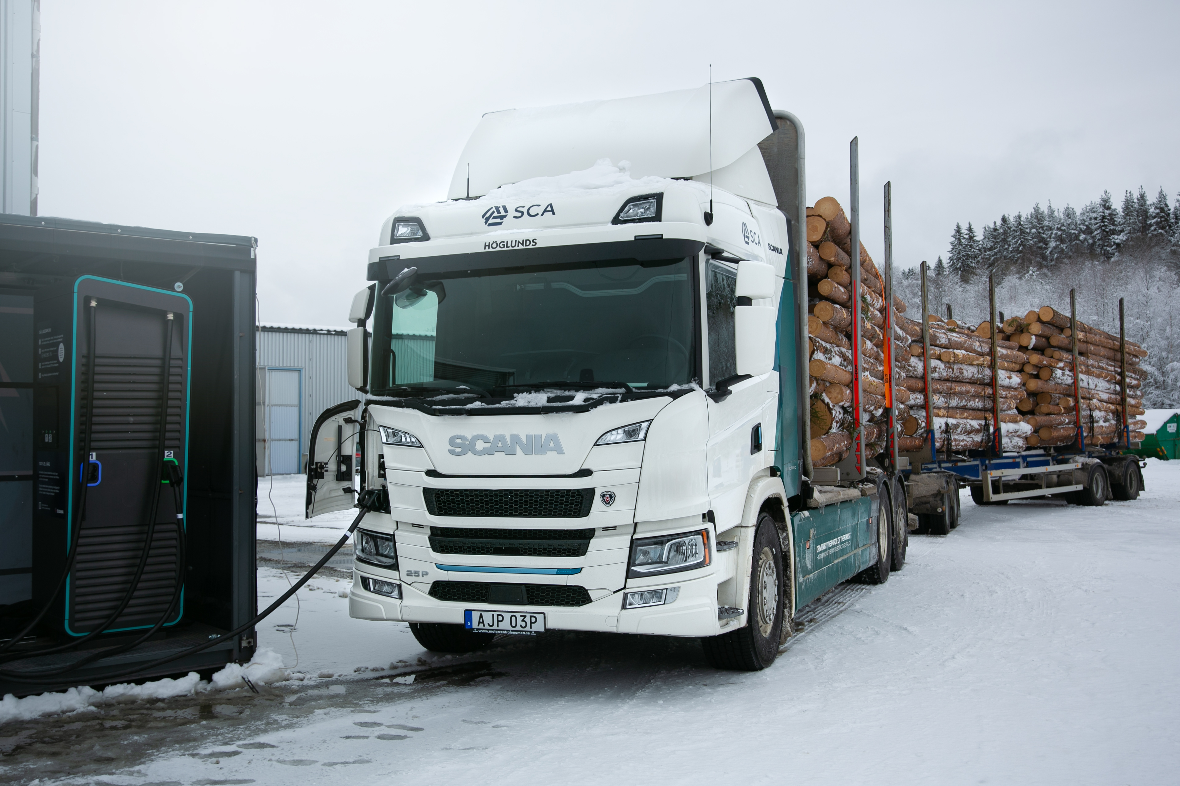 Kunder fick provköra Scania BEV 25P lastväxlare och världens första eltimmerbil. På bilden syns även Scanias mobila laddstation uppställd hos Berners Tunga Fordon i Sollefteå.